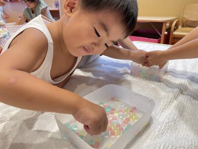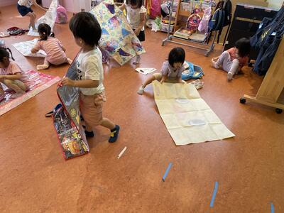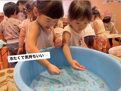 この後も、染めたハンカチをままごとに使ったり、ヒラヒラさせて遊び楽しんでいた子どもたち。私たち保育者も染色遊びは初めての体験でしたが、どんな色になるのだろう?どんな形の模様になるのだろう?と子どもたちとワクワクを共有しながら楽しく取り組むことができました。染色あそびを通して身近なものに触れ、色や形などに気づき、興味や関心を持つきっかけにつながったように思います。