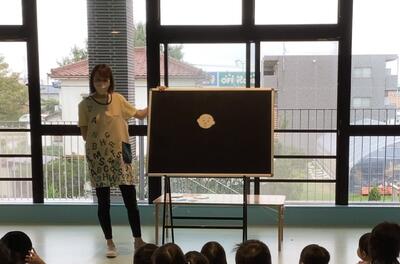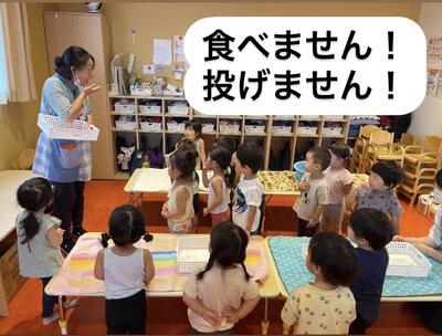 食育活動の一環で、ぶどうのある部分を使って楽しい活動の始まりです。