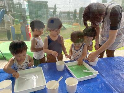 “何でも触ってみたい! “と好奇心旺盛なすいか組の子ども達に合わせて
