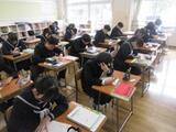 くじらの絵を真剣に見ながら描く子