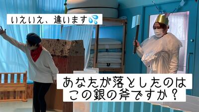 今月のお楽しみは、先生達(3人)による“金の斧 銀の斧”の劇でした