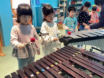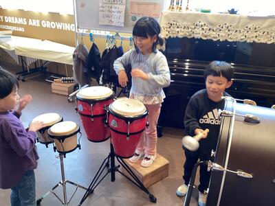 様々な楽器に触れ、 自分で選び、友だち同士で練習しあいます。